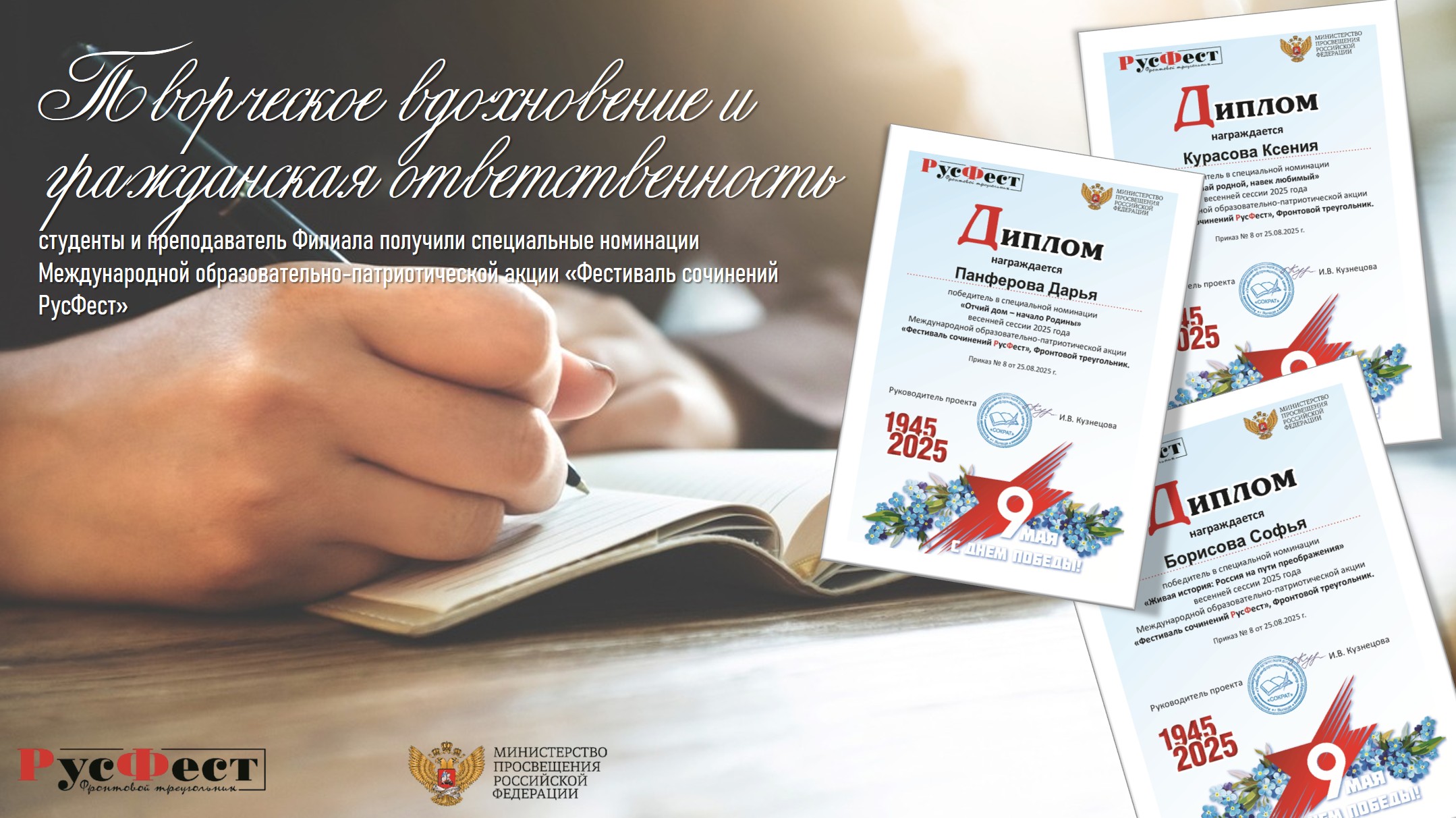 Творческое вдохновение и гражданская ответственность: студенты и преподаватель Филиала получили специальные номинации Международной образовательно-патриотической акции «Фестиваль сочинений РусФест»