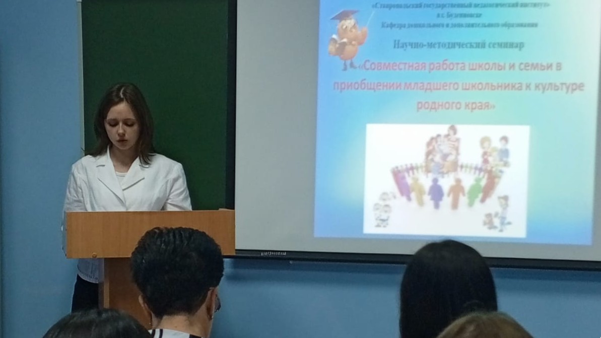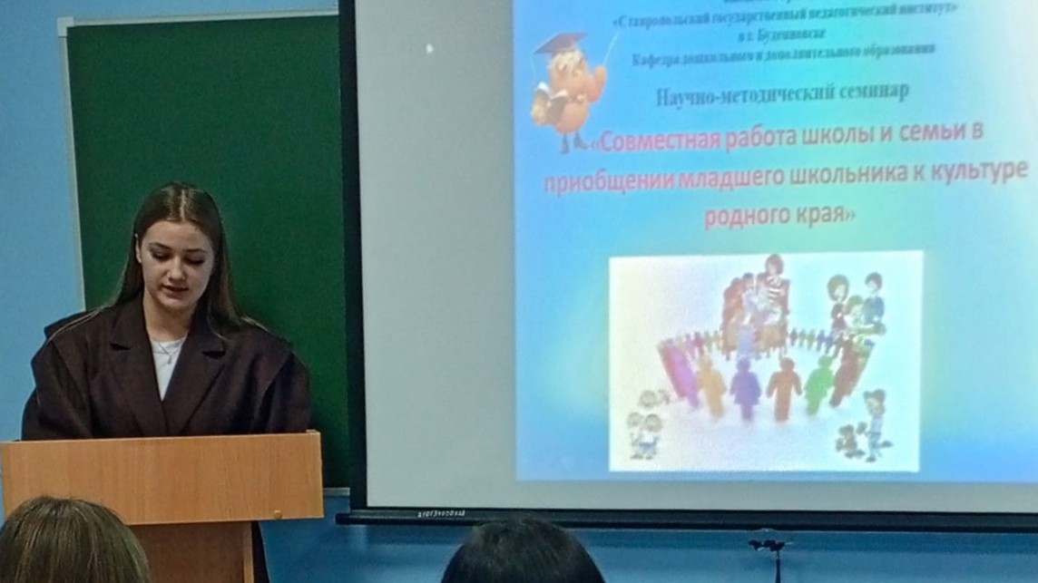 Отдельное внимание было уделено докладам студентов группы 4ДО9В Магомедовой Т., Машкович Е., Магомедовой Д., Левченко С., которые подготовили презентацию на тему работы с проектной технологией в изучении родного края. Доклады вызвали большой интерес и положительные отзывы участников. Помимо выступлений студентов, гостям семинара – учителю МОУ СОШ №4 Денису Евгеньевичу Кузнецову и советнику директора по воспитанию Юлии Сергеевне Кацубиной — также удалось рассказать о работе, осуществляемой в школе. Денис Евгеньевич поделился опытом руководства кружком по краеведению «Наше Ставрополье», а Юлия Сергеевна рассказала о работе кружка «Орлята России». Выступления педагогов были богатыми на практические рекомендации и реальные кейсы, что способствовало общему обогащению участников новыми знаниями и полезными приемами.